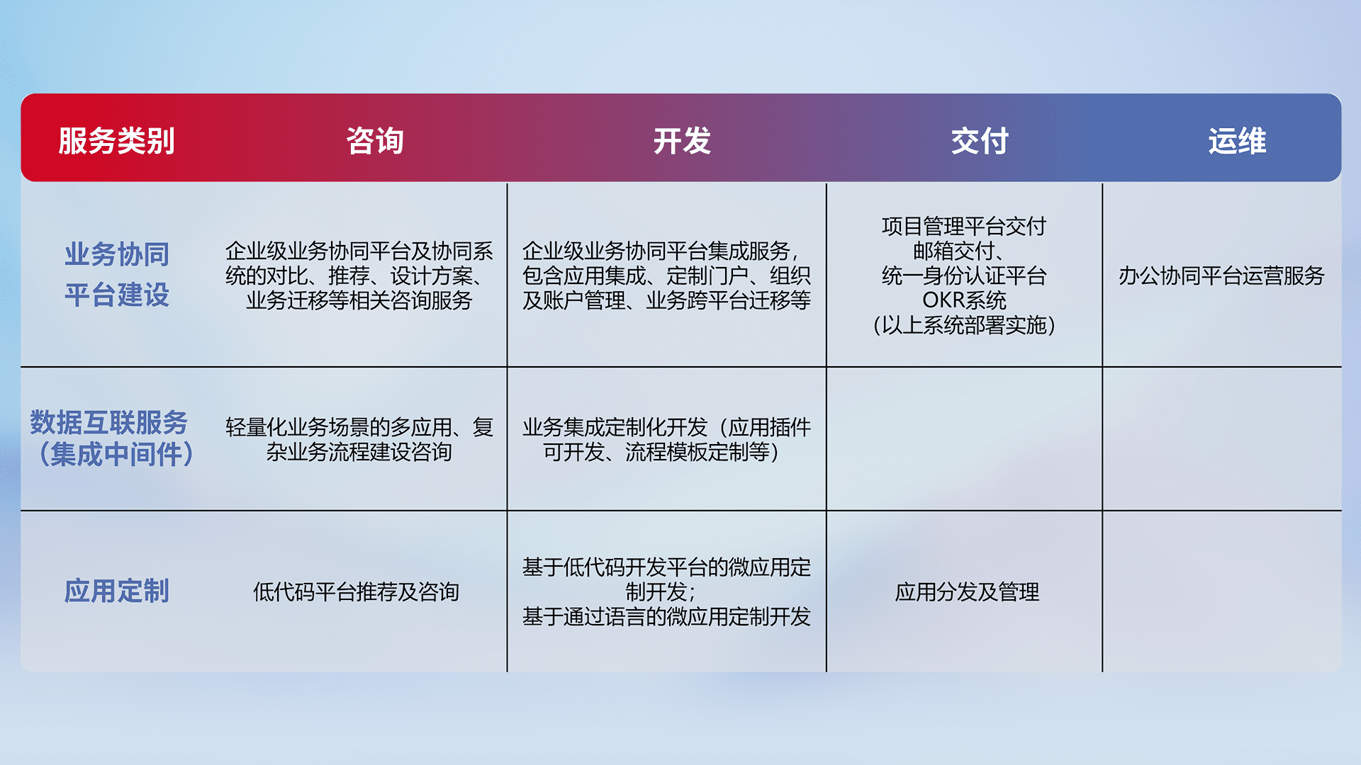 针对钉钉、、、企微、、IDaas等平台级产品提供产品的规划、、方案、、、、交付、、、、定制化开发等服务,,实现如统一协同办公、、、智能客户服务、、混合会议管理、、、、智能数据查询、、、等业务场景,,实现数字化转型。。。